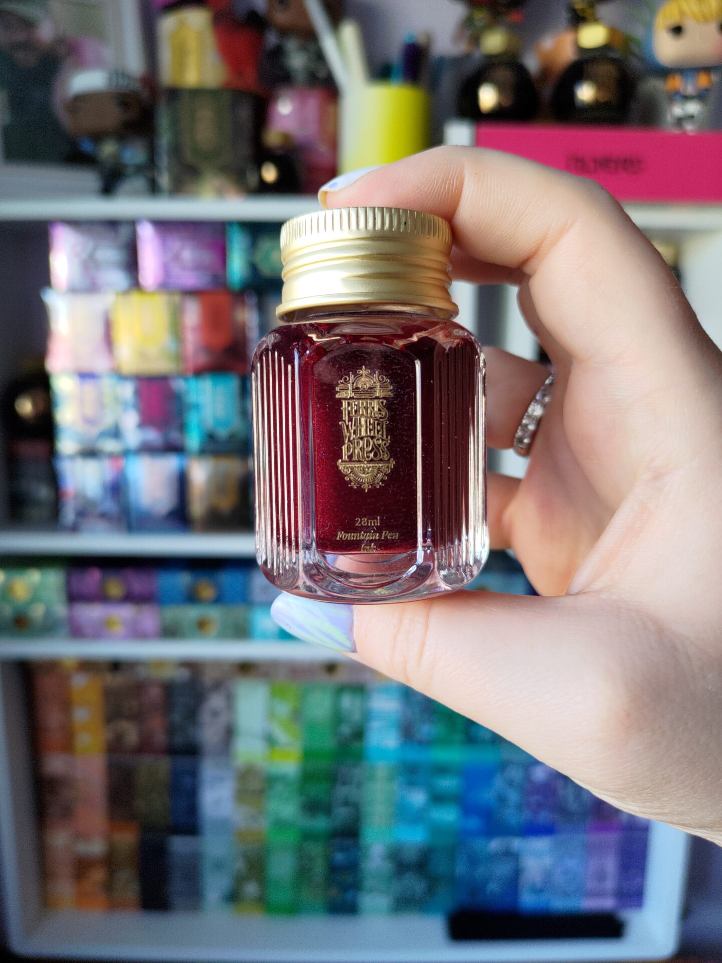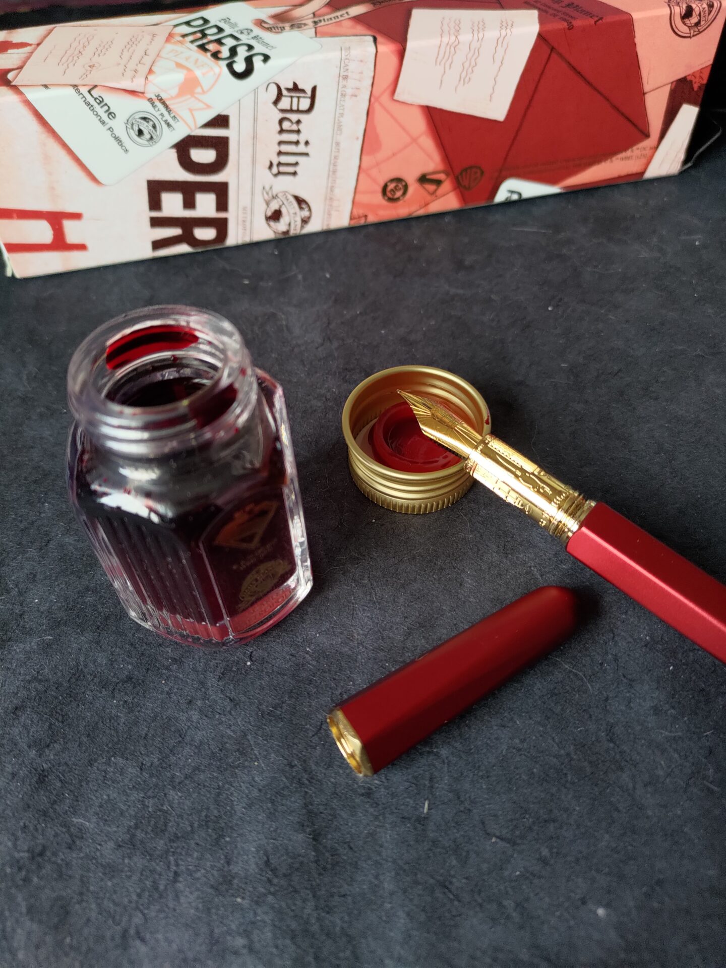 The packaging for The Marquise differs noticeably between licensed editions and the standard release. In this case, we get a sturdy, well-designed box themed accordingly. Alongside the securely mounted pen, there’s also a bottle of ink included. In my case, it’s Scarlet Metropolis — a red ink with blue shimmer, in a 20 ml bottle. Don’t worry though — despite the bottle format, it’s still fountain pen ink, not a calligraphy one.