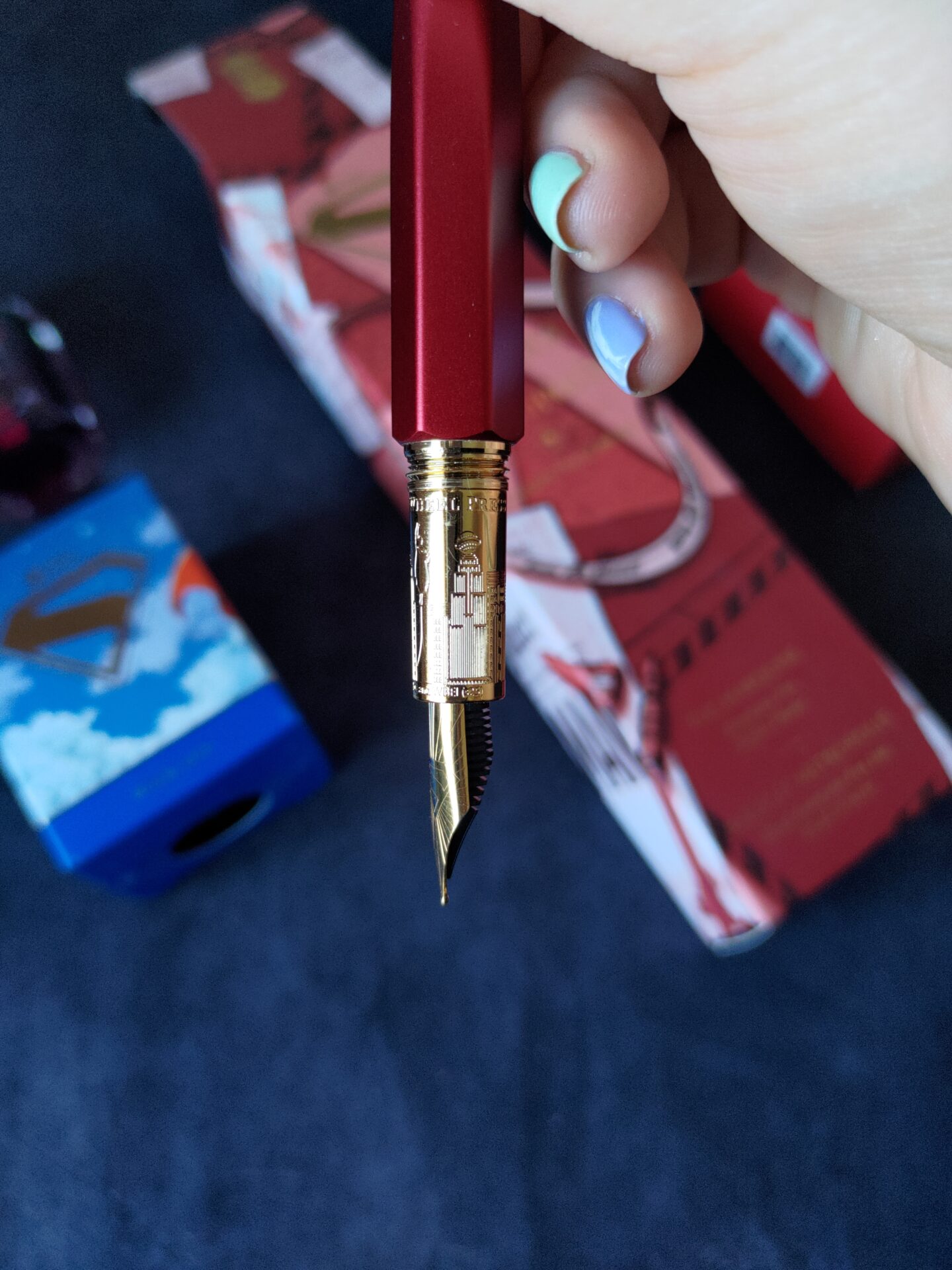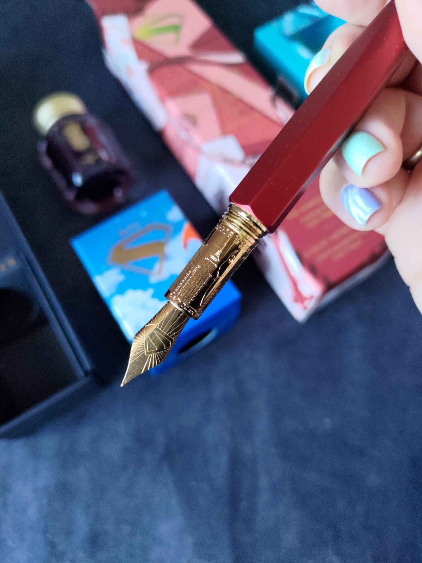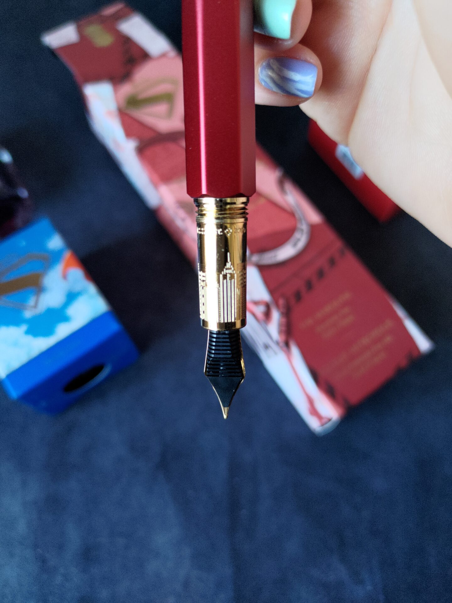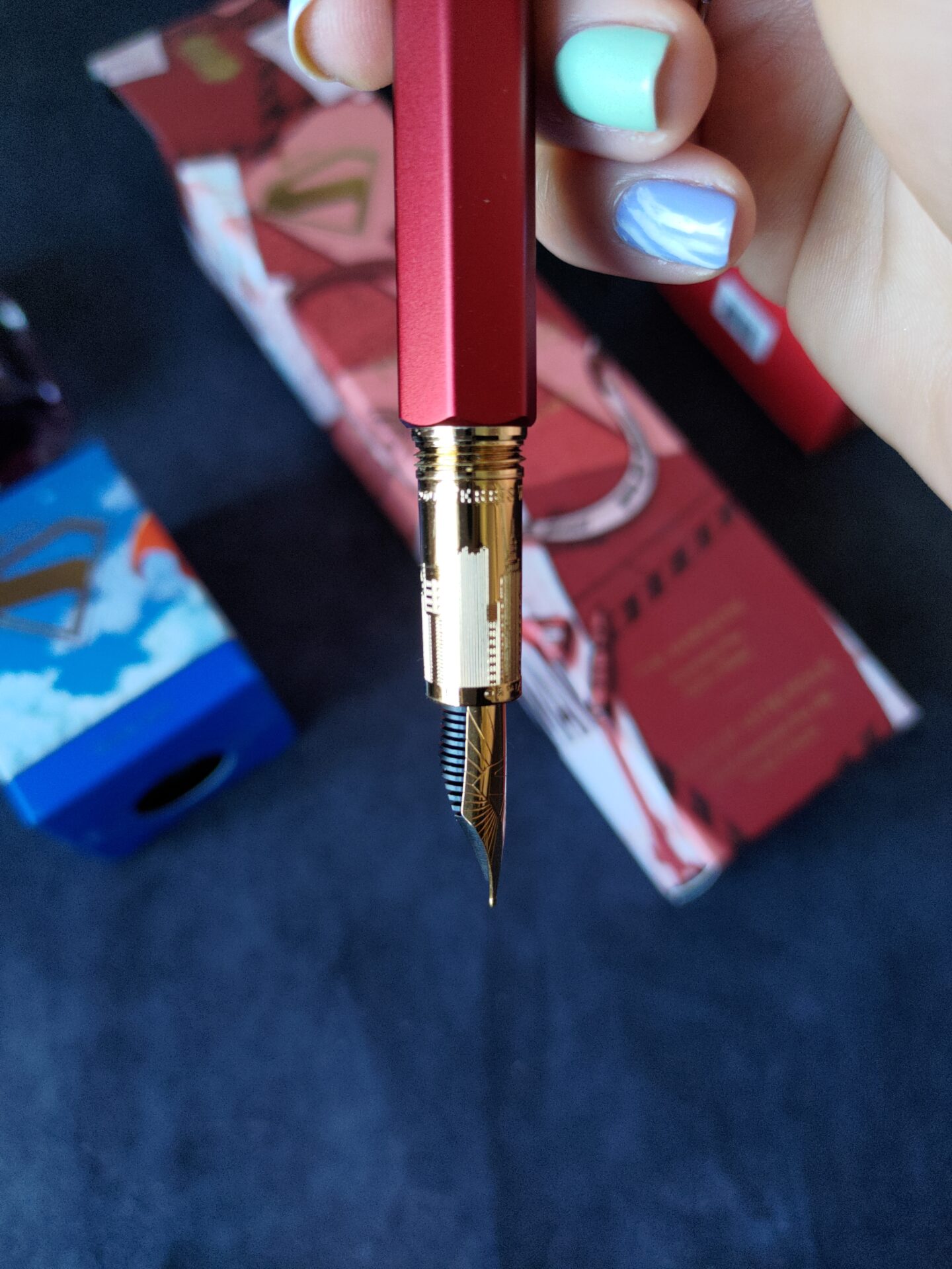 The nib, in size M, is gold-plated and decorated with the Superman logo. The nib and feed system uses the standard JoWo #6 format, which means it can be swapped out for nibs from the The Adventurers Nib set or third-party manufacturers.